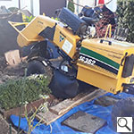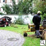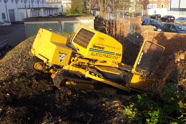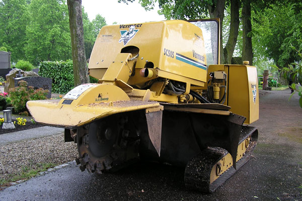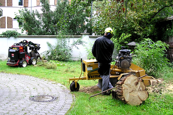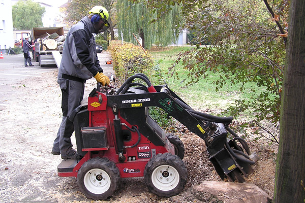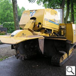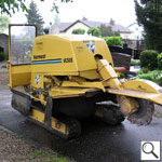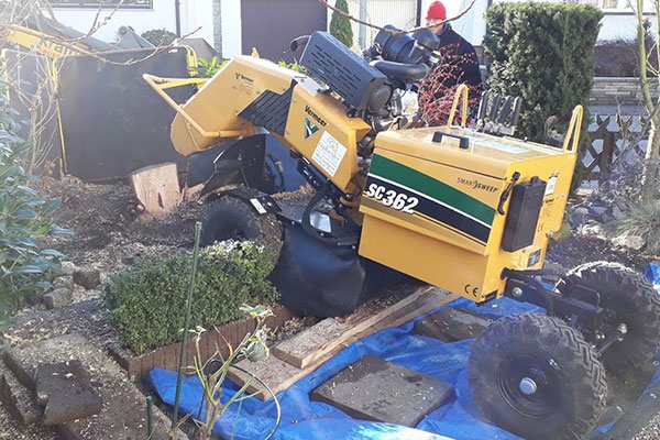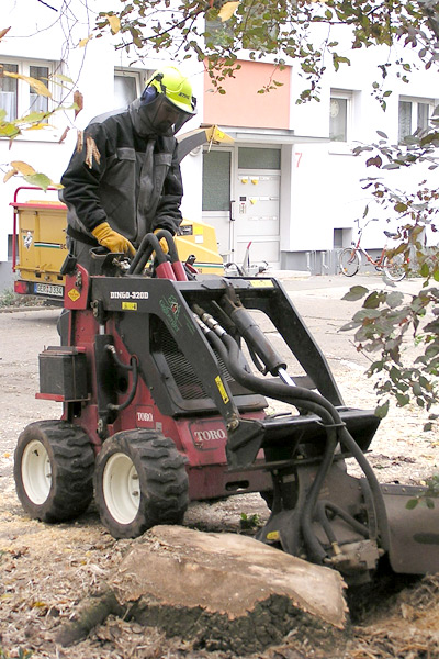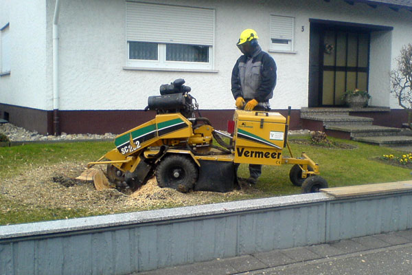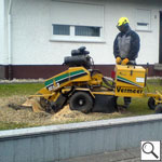 Ausfräsen der Stubben mittels moderner Spezialfräsen. Kleine kompakte und leicht zu versetzende Maschinen für Hausgärten, Friedhöfe und enge Baustellen Arbeitstiefen bis 50 cm möglich.